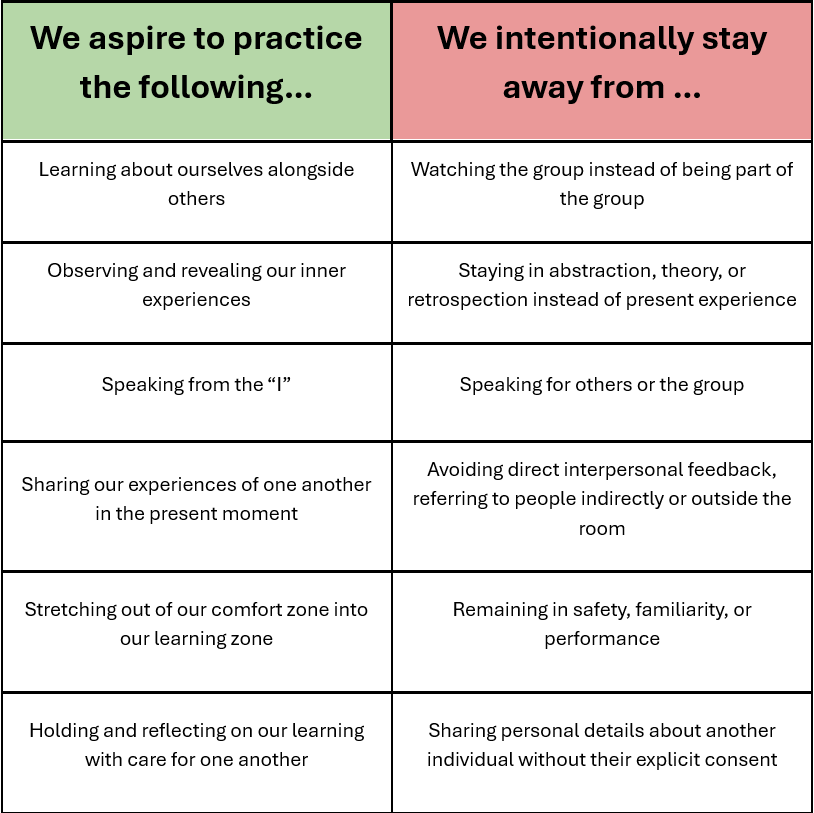 Leverage the group to learn about your impact. Try on new behaviors that you’d like to cultivate. Learn by doing. Keep your focus on what is happening now, and with those you are with.